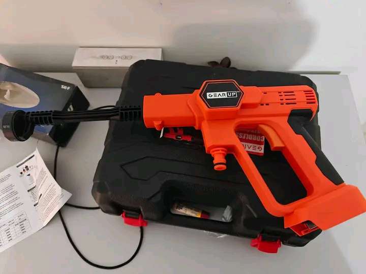 Answer: It’s a portable, rechargeable car wash spray gun with multi-nozzle options designed for cars, bikes, and home cleaning. Powered by a rechargeable battery, it delivers high-pressure cleaning without messy wires.